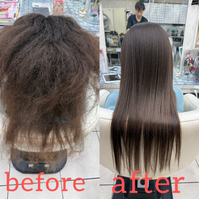 新しく生えてくる部分以外は、まったく気にならないような髪質とストレート状態にいたします。