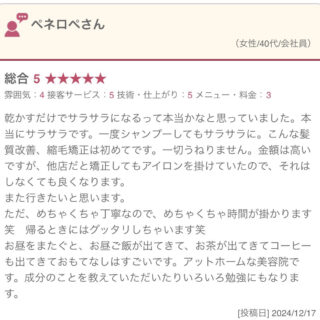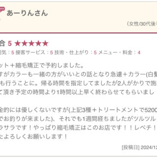 乾かすだけでサラサラになるって本当かなと思っていました。本当にサラサラです。一度シャンプーしてもサラサラに。こんな髪質改善、縮毛矯正は初めてです。一切うねりません。金額は高いですが、他店だと矯正してもアイロンを掛けていたので、それはしなくて...
