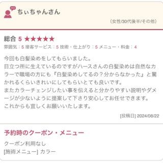 今回も白髪染めをしてもらいました。 目立つ所に生えているのですがハースさんの白髪染めは自然なカラーで職場の方にも『白髪染めしてるの?分からなかった』と驚かれるくらいきれいにしてもらいとても良いです。 またカラーチェンジしたい事を伝えると分か...