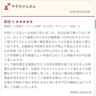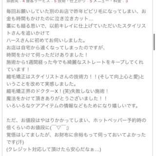 今回ハースさんへは初めて伺いました。先日は有り難うございました。ちょうど1週間になりますが梅雨真っ只中の日々もアイロン要らずでストレスも無く縮毛矯正のレベルの高さを改めて感じております。お値段は予約時の自分の予想より倍以上かかりましたが技術...