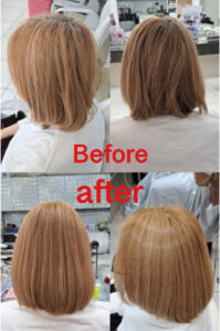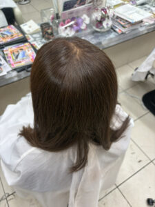施術メニューにあわせて毛先は当店のオリジナルトリートメントで同時に施術をし、よりダメージレスでツヤツヤな髪にしあげていきます。