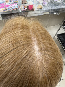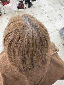 施術前のお写真です。今回は根本のお白髪を前回と同じ明るさで、明るく白髪染めしていきます。